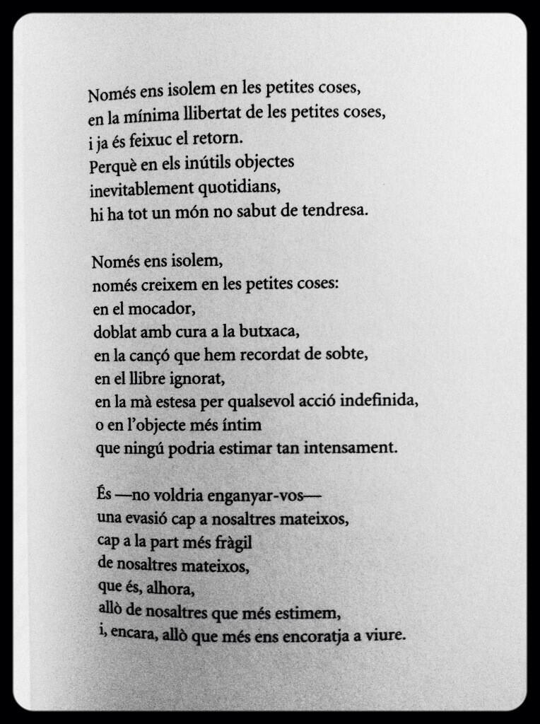 Font: Del poemari Veu incessant. Barcelona: Edicions 62, 2013. Edició de Roger Canadell i Montse Caralt. ISBN: 978-84-297-7270-8. Vist al Twitter de Llegim i piulem.